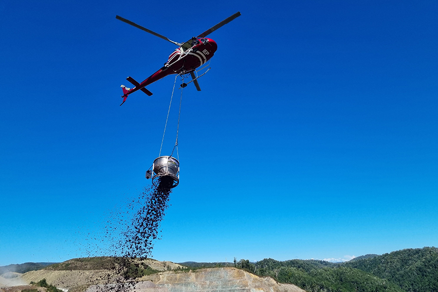 | Flourishing vegetation on the San Dieguito Lagoon banks in California after successful erosion control application. | Aerial hydraulic application of ProGanics® in Reefton, New Zealand, to revegetate a closed gold mine. |