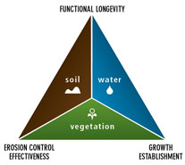 Profile’s Green Design Triangle illustrates a fundamental component of Green Design Engineering that integrates the three primary natural variables: soil, water and vegetation—with the three pillars of product performance—erosion control effectivenessgrowth establishment and functional longevity. To obtain an optimal solution of sustainable vegetation, designers must account for these natural variables while selecting products with the proper balance of performance characteristics to achieve project success, particularly when confronted with harsh soil conditions and severe slopes.