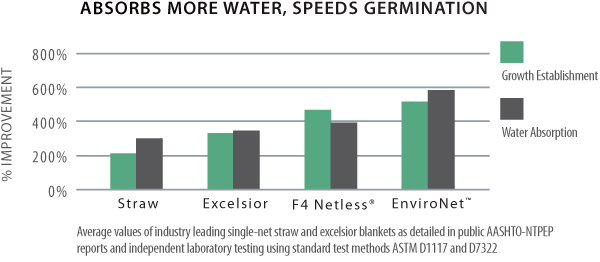 Futerra® blankets have been proven to deliver the fastest germination. Comparative growth establishment data derived from standard test methods ASTM D1117–Water Absorption and ASTM D7322–Growth Establishment, verified clear agronomic superiority of Futerra® F4 Netless® and EnviroNet™ over stitch-bonded straw and excelsior blankets.