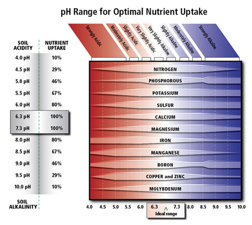 Soil pH is second only to moisture availability in its immediate impact on vegetation establishment. The following chart illustrates the availability of key nutrients at various soil pH levels.