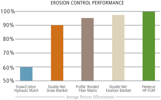 Establishing vegetation quickly and completely is the key to long-term erosion control. Compare Flexterra® HP-FGM™ to the average values of common technologies as documented in published AASHTO-NTPEP reports and independent laboratory testing using standard test method ASTM D7322.