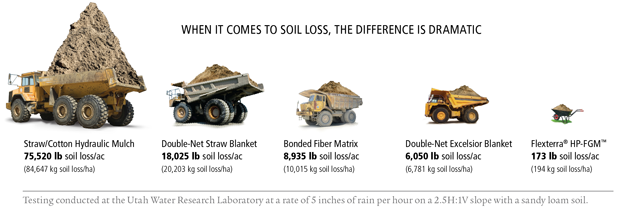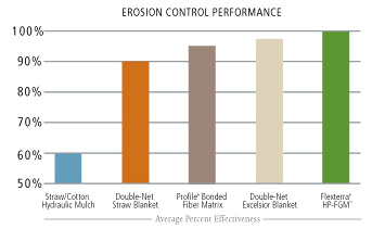 Flexterra® HP-FGM™ has demonstrated nearly perfect erosion control performance—even on slopes as severe as 0.25H:1V. It immediately bonds to the soil surface, and has proven to be greater than 99% effective upon curing. Its flexible, yet stable matrix features greater wet bond strength, yielding increased sheet flow resistance. In addition to minimizing soil loss, the turbidity (NTU) of runoff is greatly reduced. In large scale testing, Flexterra HP-FGM reduced effluent turbidities of sandy loam soils to less than 100 NTU.