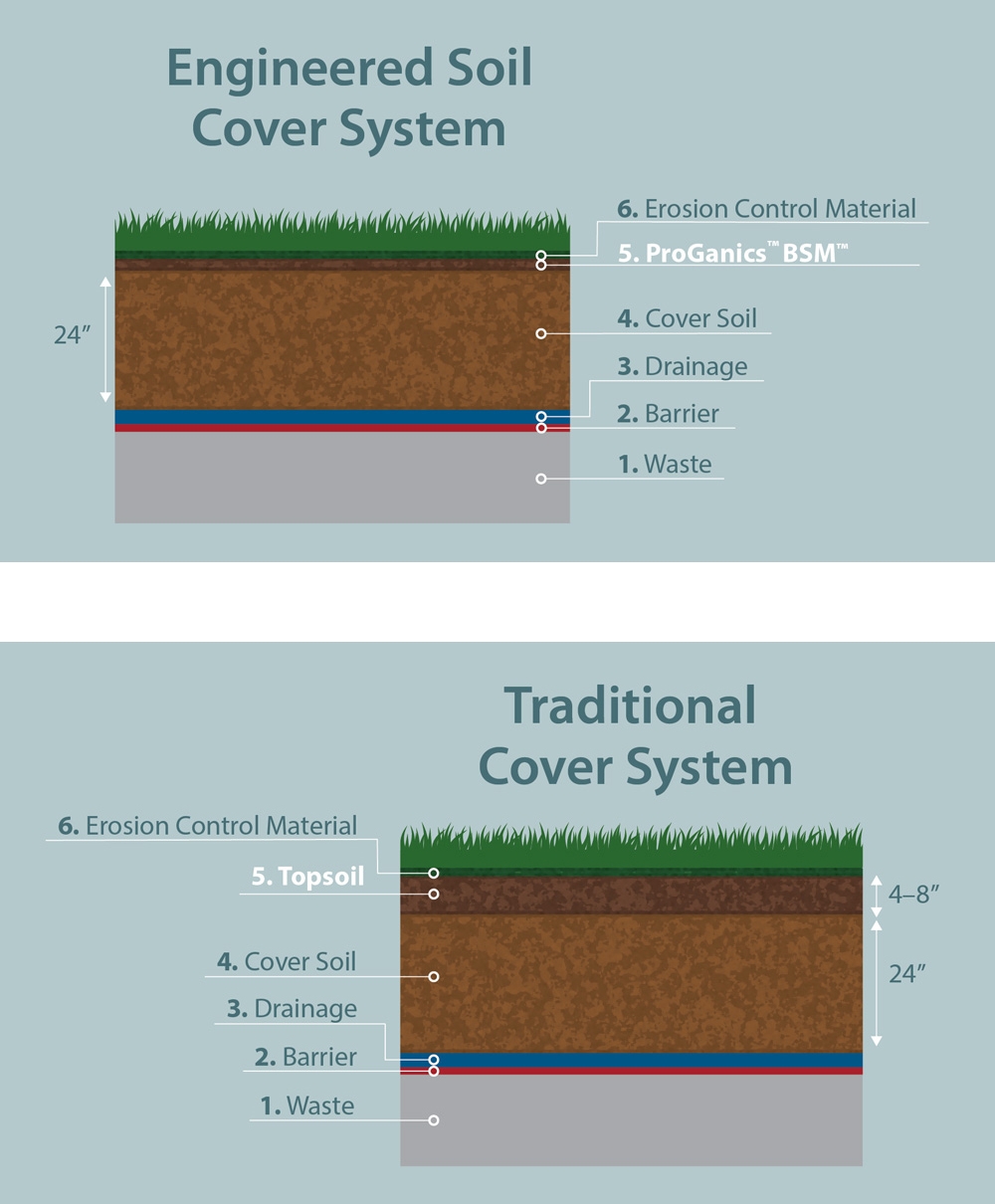 While placement of the cover soil may be relatively cost efficient, identifying and procuring soils capable of establishing sustainable vegetation can be problematic. Seldom is a nearby source of topsoil readily obtainable and production of manufactured soils to hopefully achieve desired soil properties can also be quite costly. Recently, Profile Products introduced ProGanics™ Biotic Soil Media™ (BSM™) as a cost-effective alternative to these expensive soils. BSM offer organic material with a full complement of biostimulants and soil building components that accelerate vegetative establishment and work to build sustainable soils directly upon the cover material. ProGanics also offers the convenience and ease of application using standard hydraulic seeding equipment to speed installation time. ProGanics is composed solely from recycled and naturally derived materials to provide environmentally sustainable solutions.