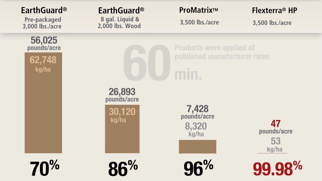 Profile’s ProMatrix EFM and Flexterra HP-FGM outperformed both of EarthGuard products in terms of soil loss per acre. Flexterra demonstrated an erosion control effectiveness of 99.98% and ProMatrix performed at 96%. EarthGuard’s products performed between 70 and 86%.