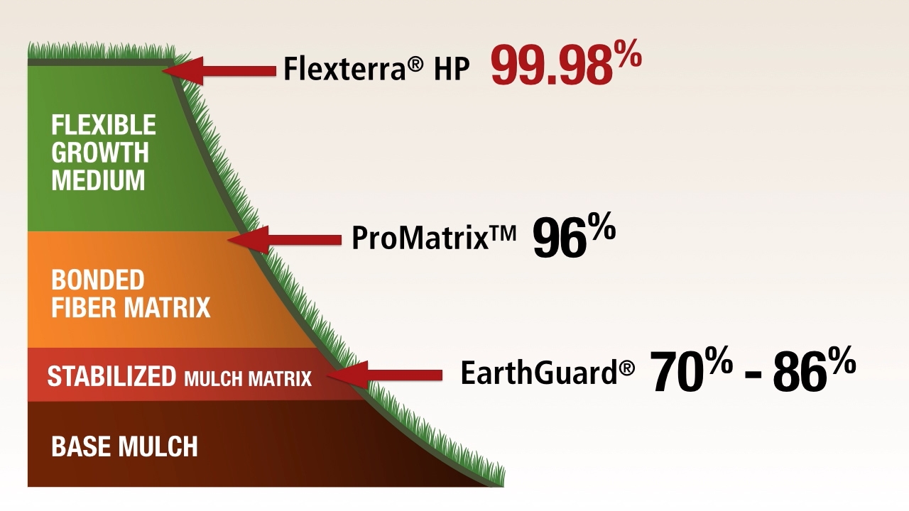 Flexterra HP-FGM was the only product to perform at the level of a Flexible Growth Medium, the highest-performing mulch category. ProMatrix EFM was the only product to perform at the level of a Bonded Fiber Matrix, while both EarthGuard products performed at the level of a Stabilized Mulch Matrix, the lowest-performing mulch category of the products tested.