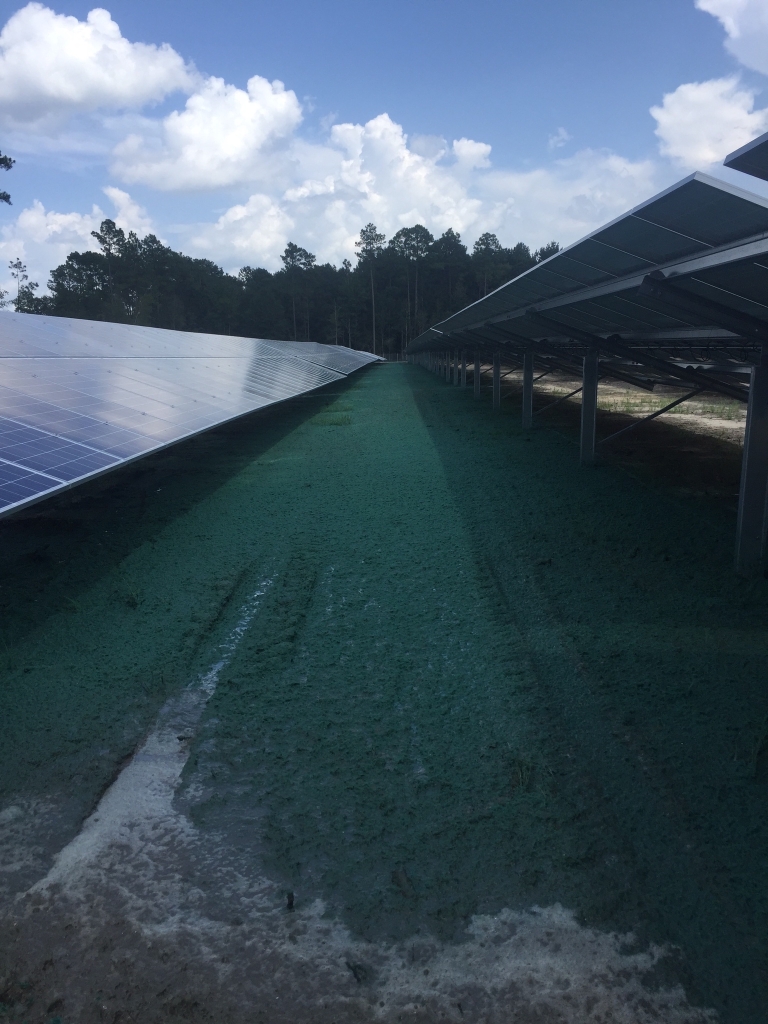 The contractor employed a combination of soil amendments and erosion control products across the site, including ProGanics® Biotic Soil Media, ProGanics® DUAL™ Biotic Soil Media + Erosion Control, and Flexterra® High Performance-Flexible Growth Medium®. On the steepest portions of the solar farm, ProGanics and Flexterra were applied at 3,500 pounds per acre to amend the soil and provide a high level of erosion control protection. On the flatter areas that still had potential for runoff issues, ProGanics DUAL was applied at 5,500 pounds per acre to provide both the soil amendment and erosion control protection of a bonded fiber matrix.